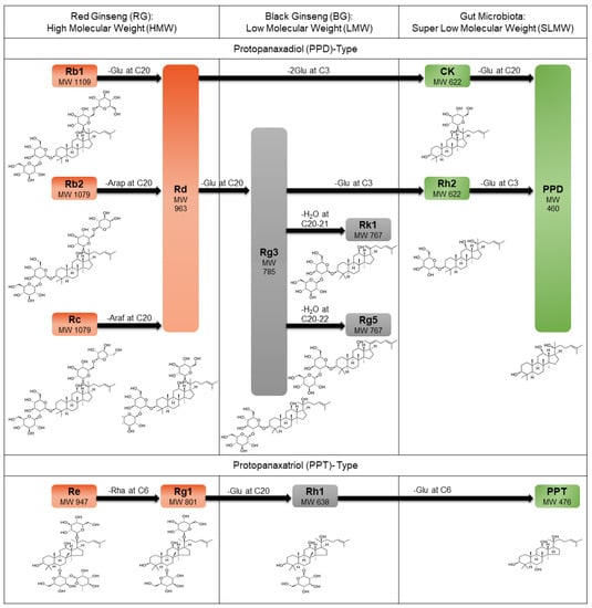 - Kim, J.-K.; Choi, M.S.; Jeung, W.; Ra, J.; Yoo, H.H.; Kim, D.-H. Effects of gut microbiota on the pharmacokinetics of protopanaxadiol ginsenosides Rd, Rg3, F2, and compound K in healthy volunteers treated orally with red ginseng. J. Ginseng Res. 2020, 44, 611–618. [Google Scholar] [CrossRef]