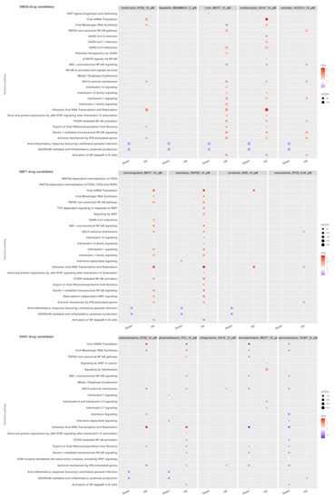 Gene Set Enrichment Analysis (GSEA) results for candidate drugs for 6M2Q, 6M71, and 6W01 SARS-CoV-2 structures with the expression signature yields from correlation analyses from DS2. Reactome pathways related to the immune system and viral infections. Only drugs with at least one pathway with an adjusted p-value < 0.05 are displayed. The GSEA table with the results is available in Supplementary Tables S7–S9.