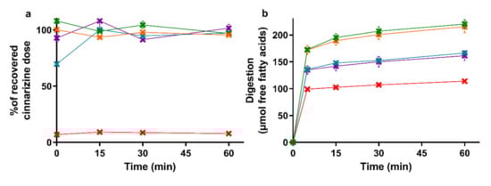 The lipase-induced lipolysis seemingly did not affect the amount of cinnarizine permeation in the present study; therefore, the need for the lipolysis step could be challenged and perhaps rather substituted with a dispersion of the formulations in SIM, as has been used in other studies [22]. This is in accordance with studies by Michaelsen et al., who showed that addition of the lipase inhibitor Orlistat to SNEDDSs did not change the AUC of the plasma concentration–time profile of halofantrine and fenofibrate after oral dosing to rats [50,51]. However, other LbDDSs or drugs might be affected differently by lipid digestion.