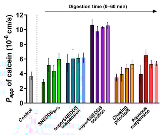 When comparing the calcein Papp values obtained in the presence of each digesting formulation with the calcein Papp of the blank control (SIMCAL), no difference was observed, except for a significantly higher Papp (p ≤ 0.05) in the presence of the superSNEDDS solution (at all four time-points) (Figure 3). Generally, a slight tendency towards an increased Papp of calcein in the presence of the digestive enzymes (0 min lipolysis time compared to 15–60 min of lipolysis) was observed for all formulations, although this difference was not found to be significant (Figure 3, Figure S1).