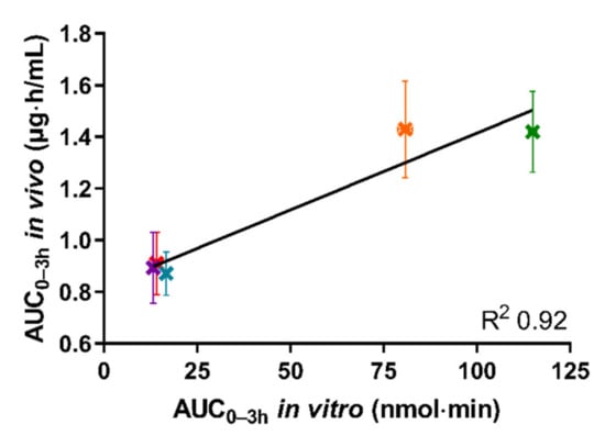 Statistical analysis of the obtained data was performed using GraphPad Prism ver. 7.04 (GraphPad Software, San Diego, CA, USA). Student’s t-test and analysis of variance (ANOVA) were used to compare the means of two or more groups, respectively, with a significance level of α = 0.05. All data are shown as the mean ± standard error of the mean (SEM) for easier comparison with the reference study. The PK parameters from the reference study were determined using WinNonLin ver. 5.2 (Pharsight Corporation, Mountain View, CA, USA). For the present study, the AUC0–3h of the in vivo plasma concentration-time profile was determined from the raw data granted by Siqueria, SD [39] (Table S1) in order to make a direct comparison to the in vitro AUC0–3h.
