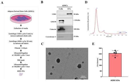 Isolation and characterisation of adipose tissue-derived stem cell extracellular vesicles (ADSC-EVs). (A) A schematic diagram demonstrating the isolation of EVs from ADSCs (created with BioRender.com). (B) Western blot analysis of ADSCs (cells and EVs); anti-CD81, anti-GM130, calnexin, and anti-cytochrome-C antibodies were used. (C) The morphology of ADSC-EVs visualised by TEM (scale bar: 200 nm). (D,E) NTA of ADSC-EVs (n = 5). The results are expressed as the mean ± SD values of the experiment.