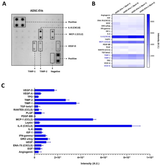 Proteins extracted from ADSC-EVs (150 µg/blot) of two human subjects were used for this assay. The Human Angiogenesis Array (RayBiotech, Peachtree Corners, GA, USA) was used according to the manufacturer’s instructions. The intensity was measured by GelQuant.NET software (Version 1.8.2) (BiochemLabSolutions.com, San Francisco, CA, USA).