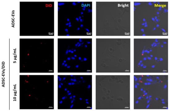 The internalisation of ADSC-EVs was analysed by confocal microscopy. The EVs were labelled with lipophilic dye (DiD) by incubating for 20 min at 37 °C and washing with PBS by ultracentrifugation, as mentioned above. The DiD-labelled ADSC-EVs (5 or 10 µg/mL) or unlabelled ADSC-EVs (5 or 10 µg/mL) were incubated with endothelial cells for 2 h at 37 °C before methanol fixation. Antifade agent was used to mount the coverslips (Vector Laboratories, Burlingame, CA, USA). The uptake of ADSC-EVs was observed by LSM 800 laser scanning microscopy (Carl Zeiss, Baden-Württemberg, Germany).