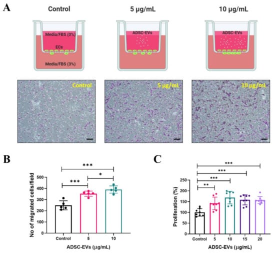 Angiogenesis is a complex multistep process, wherein endothelial cells migrate, proliferate, and generate new blood vessels. The ability of ADSC-EVs to induce the migration of endothelial cells was examined. The transwell migration results showed that ADSC-EVs (5 and 10 µg/mL) were able to significantly (p < 0.001) increase the migration of endothelial cells, which was further increased by treatment with 10 µg/mL of ADSC-EVs (p < 0.05). Thus, endothelial cell migration was increased by ADSC-EVs in a dose-dependent manner (Figure 4A,B). Next, the ability of ADSC-EVs (5, 10, 15, and 20 µg/mL) to induce the proliferation of endothelial cells was investigated. The results showed that the proliferation of endothelial cells significantly increased following treatment with ADSC-EVs (5 µg/mL: p < 0.01 and 10–20 µg/mL: p < 0.001) compared with the control (Figure 4C). These results show that ADSC-EVs are capable of inducing the migration and proliferation of endothelial cells.