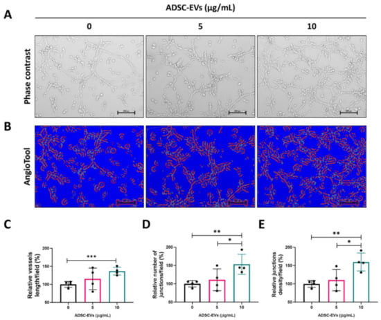 Matrigel Growth Factor Reduced Basement Membrane Matrix (Conc: 100%) (Matrigel; Corning) was coated onto 24-well culture plates followed by incubation at 37 °C for 1 h to allow the gel to settle. Then, 2 × 104 endothelial cells/well were added into the plates followed by ADSC-EVs (5 and 10 μg/mL). After 4 h, the cells were visualised and imaged (four images/group) with fluorescence microscopy (AXIO, Zeiss, Oberkochen, Germany). The total vessel length, number of junctions, and density of junctions were counted/measured automatically (n = 4) by AngioTool64 software (National Cancer Institute, Radiation Oncology Branch, Angiogenesis Core Facility, Maryland, MD, USA) [].