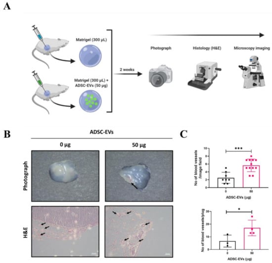 Treatment with ADSC-EVs increased the number of blood vessels in a Matrigel plug mouse model. (A) A schematic diagram of the in vivo Matrigel plug mouse model (figure created with BioRender.com). (B) Representative photograph and H&E staining of the Matrigel plugs for the control and Matrigel + ADSC-EVs (50 μg) groups; black arrows denote blood vessels (scale bar: 50 μm). (C) The number of blood vessels was counted from the images of H&E staining. * p < 0.05, *** p < 0.001 by Student’s t-test.