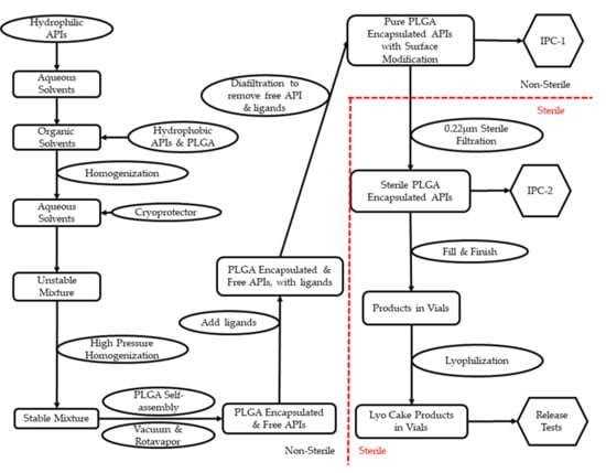 To promote promising formulations from the R&D stage to clinical trials, drug products need to be manufactured under certain guidelines. Current Good Manufacturing Practice (cGMP) are regulations enforced by the FDA to ensure the quality of pharmaceutical products []. Most PLGA NP-based pharmaceutical products or medical devices are either injectable or implantable []. Therefore, sterility and potency are among the top-quality aspects to be considered for PLGA NPs. Per cGMP regulations, sterile products must be manufactured in a registered sterile facility []. Furthermore, facilities need to show that a sterile environment is properly maintained with validated sanitization []. PLGA NP-based pharmaceutical products have several steps during production: (1) dissolution and mixture of the active pharmaceutical ingredient (API) and PLGA; (2) stabilization of the mixture and removal of organic solvents; (3) separation of free API from PLGA–API product; (4) sterilization; (5) fill-finish. Table 2 presents selected publications showing processing details in the R&D stage.