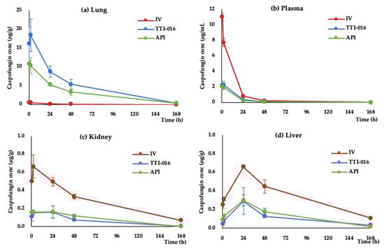 Time-dependent concentration curve in tissues of IV CANCIDAS®, inhaled TTI-016 and API cohorts. Caspofungin concentrations were shown in (a) lung, (b) plasma, (c) kidney, and (d) liver.