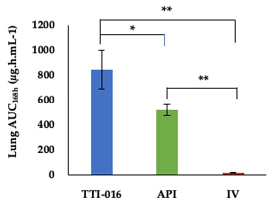 AUC168 h in lung of IV CANCIDAS® and aerosolized TTI-016 and API. The data are presented as the mean values (n = 3) ± SD. The asterisk (*) corresponds to significant difference (p < 0.05); the double asterisk (**) represents significant difference (p < 0.01).