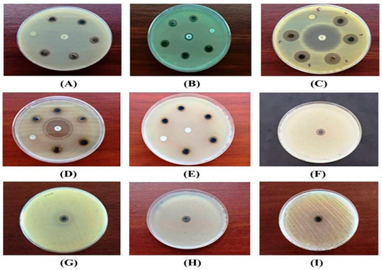 Antimicrobial activity of Eh-AgNPs against (A) B. cereus (ATCC 10876), (B) S. aureus subsp. aureus (ATCC 11632), (C) E. coli (ATCC 10536), (D) P. aeruginosa (ATCC 10145), (E) C. albicans (ATCC 10231), (F) MDR S. pneumoniae (ATCC 700677), (G) MDR E. faecium (ATCC 700221), (H) MDR S. aureus subsp. aureus (ATCC 33592), and (I) MDR E. coli (NCTC 13351).
