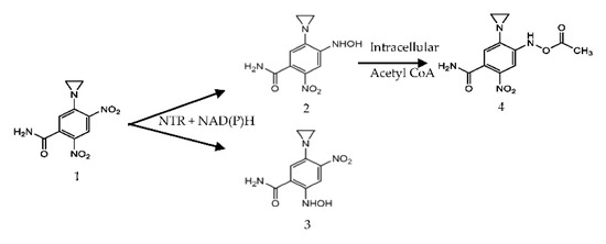 Nitroreductases (NTRs) are flavin mononucleotide (FMN) containing enzymes [17,18,19] which have been strongly implicated for a potential role in cancer prodrug therapy due to their ability to reduce organic nitroaromatic compounds such as the prodrug 5-(aziridin-1-yl)-2,4-dinitrobenzamide (CB1954) [20,21,22,23,24]. The CB1954 prodrug undergoes the reduction of one of its nitro groups to hydroxylamine derivatives in the presence of an NTR with NADH or NADPH present as a cofactor [24], the schematic of this reduction is presented in Figure 1. The 4-hydroxylamine derivative from the reduction reacts with intracellular thioesters, such as acetyl CoA, to form a highly cytotoxic product that causes DNA interstrand cross-linking resulting in rapid cell death [8,24]. It is important to note however that the 2-hydroxylamine derivative itself is also highly toxic and exhibits a greater bystander effect than the 4-hydroxylamine but as it does not react to form a DNA cross-linking species it is the less desirable product of the two. Thus, the discovery and development of nitroreductases that preferentially generate the 4-hydroxylamine derivative, rather than the 2-hydroxylamine product, is another area of research that is of growing interest [24,25].
