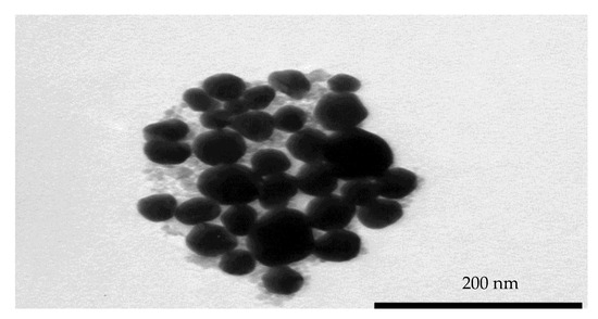 A TEM image of the synthesis and purified AuMNPs was obtained, and it was established that the sample contained predominately AuMNPs with a small amount of uncoated Fe3O4 the sample (Figure 2).