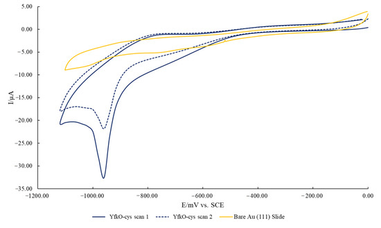 Cyclic voltammogram showing a reduction cycles of a 70 bare Au(111) coated glass slide and two consecutive reduction cycles of an Au(111) coated glass slide after 48 h incubation with YfkO-cys: scan 1 (solid line) = −959.47 mV, −32.60 µA and scan 2 (dashed line) = −959.47 mV, −21.82 µA. The potential is vs. SCE in an electrolyte of 0.1 M NaOH.