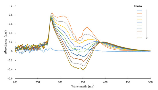 Once purified, the proteins were tested for their reactivity towards CB1954 and ability to reduce its nitro groups. Active proteins would be able to reduce CB1954 to either the 2- or 4-hydroxylamine derivatives in the presence of a cofactor, which in this case was NADH. This could be monitored using UV-Visible spectroscopy as with each scan for an active protein the peak corresponding to NADH would decrease (λ-max = 340 nm) and the peak corresponding to the CB1954 hydroxylamine derivatives would increase (λ-max = 420 nm) (Figure 5).