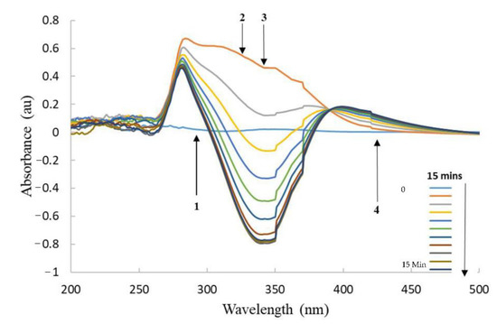 UV-Vis spectra of AuMNP immobilised YfkO-cys showing the enzymatic activity assay with increasing time. (1) NTR absorbance ~290 nm. (2) Reduction of CB1954 λ-max = 327 nm. (3) Oxidation of NADH λ-max = 340 nm. (4) Production of CB1954 hydroxylamine derivatives λ-max = 420 nm.
