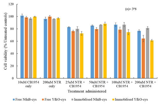 Percentage cell viability assays were carried out using the ovarian cancer cell line, SK-OV-3, relative to untreated controls, in the presence of increasing concentrations of free or immobilised NfnB-cys or YfkO-cys, with a constant concentration of CB1954 added (Figure 7). The controls used were cell culture medium only, the enzyme only and prodrug only, and data points were plotted based on the averages of at least three repeats. The CB1954 concentration was fixed at 10 µM so that the results of the cell viability assays could be related to clinical results. The maximum concentration of CB1954 achievable in vivo cannot exceed 10 µM, due to the maximum tolerated dose established during clinical trials [21,38,39].