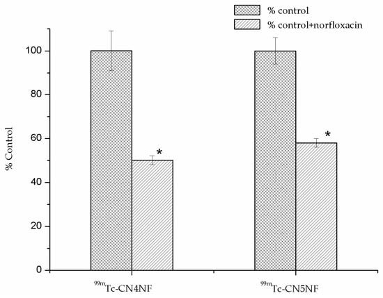 To determine the specificity of [99mTc]Tc-CN4NF and [99mTc]Tc-CN5NF binding to bacteria, norfloxacin was used as an inhibitor. The bacteria were preincubated with 0.1 mL of norfloxacin (1 mg/mL) for 1 h at 37 °C. Then, the radiolabeled complexes were added followed by incubation for 1 h at 37 °C. The bacteria binding value was calculated as described above. Each group of measurements are carried out six times in parallel. The results are expressed as the mean ± SD.