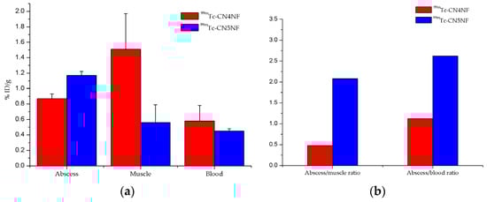 As demonstrated in Figure 4, the uptake values of [99mTc]Tc-CN5NF in muscle (0.56 ± 0.23) and blood (0.45 ± 0.03) at 4 h post-injection were lower than the uptake values of [99mTc]Tc-CN4NF (muscle 1.51 ± 0.46 and blood 0.58 ± 0.20). Since [99mTc]Tc-CN5NF exhibited significantly higher abscess/muscle and abscess/blood ratios, the infection uptake of [99mTc]Tc-CN5NF was higher than that of [99mTc]Tc-CN4NF.