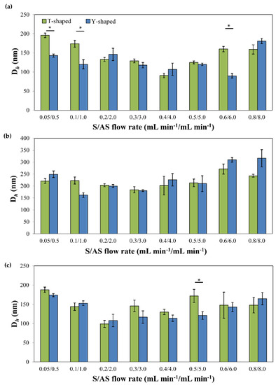 The effect of S/AS flow rate changes on the hydrodynamic diameter (Dh) of excipient-free pure (a) imatinib, (b) dasatinib and (c) tofacitinib nanoparticles produced by using T- and Y-shaped devices, as measured by DLS at 25 °C. A constant S/AS volume ratio of 1/10 was used. * Denotes statistically significant difference in the Dh between the two channel geometries (p < 0.01).