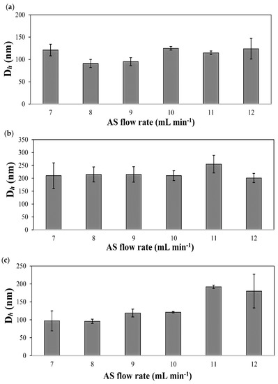 The effect of the variation of the AS flow rate on the hydrodynamic diameter (Dh) of excipient-free pure (a) imatinib, (b) dasatinib and (c) tofacitinib nanoparticles produced by using a Y-shaped device, as measured by DLS at 25 °C.