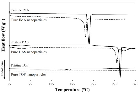 To support the PXRD results, the thermal behavior of the pristine and nanonized drugs was analyzed by DSC. Pristine IMA showed melting temperature (Tm) at 215 °C (Figure 6). Pristine DAS and TOF showed two melting temperatures at 287 and 318 °C and at 148 and 168 °C, respectively, suggesting the presence of a mixture of different polymorphs [93,94,97]. The transitions in pristine TOF were very weak with very broad peaks (Figure 6). Nanonization led to a decrease of the Tm of IMA to 206 °C and to 280 and 295 °C for DAS. In addition, a decrease of the melting enthalpy (Δh) of both drugs was observed (Table 4). These results confirm their semi-crystalline nature, though with a smaller degree of crystallinity than the pristine counterparts. Nanonized TOF did not show any thermal transition, which confirmed the very low crystallinity of these nanoparticles, in good agreement with PXRD data. The fact that IMA and DAS nanoparticles resulted in smaller amorphization extent compared to TOF counterparts could be attributed to the lower logP value of TOF. Zhu demonstrated that there is a good correlation between the drug logP value and the particle stability during nanoprecipitation, reporting that drugs characterized by lower logP values (<2) tend to have a more metastable nature in their nanonized form [84]. However, the exact mechanism responsible for the amorphization of crystalline/semi-crystalline drugs upon nanoprecipitation remains controversial [98].
