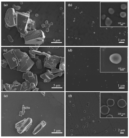 HR-SEM micrographs of (a) raw imatinib, (b) pure imatinib nanoparticles, (c) raw dasatinib, (d) pure dasatinib nanoparticles, (e) raw tofacitinib and (f) pure tofacitinib nanoparticles.