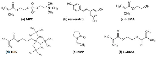 Chemical structure of (a) 2-methacryloyloxyethyl phosphorylcholine (MPC), (b) trans-resveratrol, (c) 2-hydroxyethyl methacrylate (HEMA), (d) 3-(methacryloyloxy)propyltris(trimethylsiloxy)silane (TRIS), (e) N-vinylpyrrolidone (NVP) and (f) ethylene glycol dimethacrylate (EGDMA).
