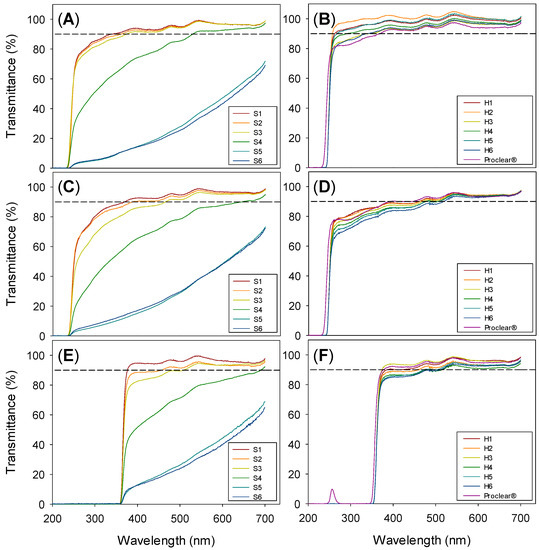 Light transmission of silicone (left) and HEMA (right) hydrogels swollen in water (A,B), SLF (C,D) and resveratrol loading solution (E,F). Dashed lines indicate the acceptance value of 90% transmittance.