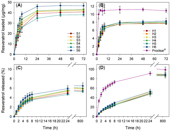Resveratrol loading profiles for silicone (A) and HEMA (B) based hydrogels at 36 °C and 180 rpm for 72 h, and release profiles from silicone (C) and HEMA (D)-based hydrogels in NaCl 0.9% medium at 36 °C.