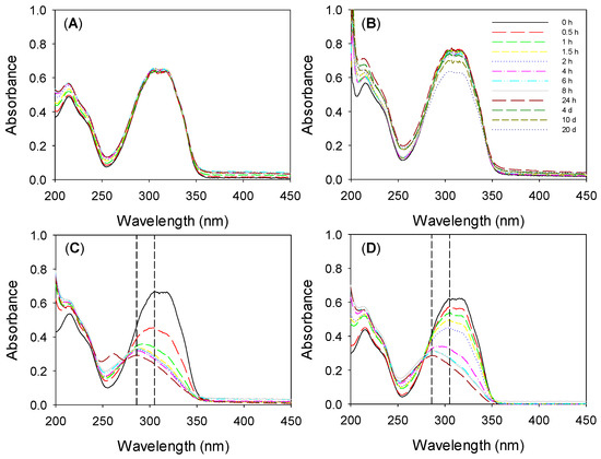UV–Vis spectra recorded for resveratrol in ethanol:water 10:90 v/v medium (A) and resveratrol in NaCl 0.9% (B) without light at 36 °C and 180 rpm for several days, and resveratrol in ethanol:water 10:90 v/v medium exposed to white light (C) and working area light (D) for 24 h. Dashed lines indicate the maximum wavelength of cis-resveratrol (286 nm) and trans-resveratrol (305 nm).