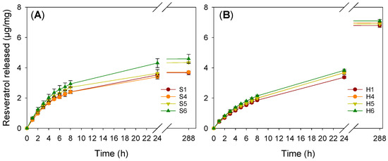 Regarding the minor effect of MPC on the resveratrol loading and release results, only formulations prepared without (S1, H1) and with the highest proportions of MPC (S4, S5, S6 and H4, H5 and H6) were considered for subsequent studies.