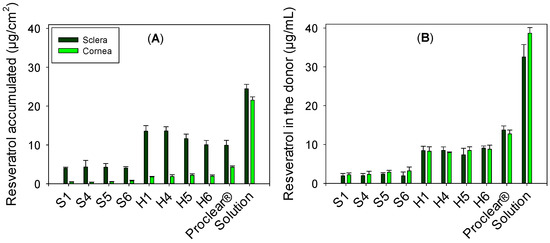Amounts of resveratrol accumulated in cornea and sclera (A) and remaining in the donor chamber (B) when delivered as resveratrol-loaded silicone and HEMA hydrogels, and Proclear® contact lenses, or as resveratrol solution (70 µg/mL).