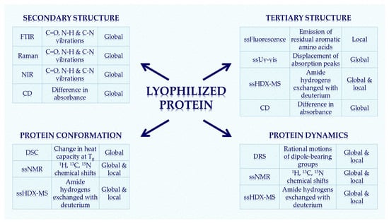 The most common analytical techniques for the structural characterization of proteins in solid pharmaceutical forms are presented with corresponding type of measurements. Changes in secondary/tertiary structure and conformation can be studied on a global and local scale. Protein dynamics can also be traced using some of the above methods. FTIR—fourier transform infrared; NIR—near-infrared; CD—circular dichroism; ss—solid-state, HDX-MS—hydrogen-deuterium exchange mass spectrometry; DSC—differential scanning calorimetry; NMR—nuclear magnetic resonance; DRS—dielectric relaxation spectroscopy.