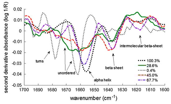 Bai et al. investigated the secondary structure of proteins in lyophilized formulations using nondestructive NIR spectroscopy (Figure 5) [51]. In general, different protein secondary structures yield different NIR spectra [55]. Using band narrowing techniques, such as second derivative, we can gain some insight into the correlation between protein absorption bands and different secondary structure elements [56]. For example, the amount of intramolecular hydrogen bonding can predict the conformational stability of a protein in the solid state. A properly folded protein will have many more intramolecular hydrogen bonds, as reflected by a decrease in amide II band frequency [57,58].