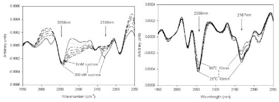NIR (near-infrared) spectra as second derivatives of structural studies on lyophilized cytochrome c. The influence of sucrose content on the preservation of secondary structure is shown in the left spectra, while the influence of temperature on protein stability can be seen in the right ones. Reproduced with permission from [51], Wiley, 2005.