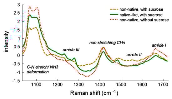 Raman spectroscopy often complements infrared analysis because it provides information about molecular vibrations and is useful for studying different states of aggregation of biopharmaceutical samples. Similar to infrared spectroscopy, Raman spectroscopy provides sample signature spectra in the fingerprint range. There is also no sample preparation, making it a relatively simple technique compared to some other spectroscopies. Unlike infrared spectroscopy, Raman spectroscopy is based on inelastic scattering. The Raman Effect occurs when a beam of intense radiation, typically from a laser (green, red, etc.), passes through a sample. The protein molecules experience a change in molecular polarizability as they vibrate. The change in polarizability yields information about the peptide backbones and secondary structures of the proteins. Two major advantages of Raman spectroscopy compared to FTIR are the weak scattering and reduced noise due to water. Consequently, in addition to the solid state, proteins can also be studied in their native (aqueous) state [61,62,63]. Typical regions in Raman spectra associated with the components of the secondary structure are the amide I region for the α-helix structure (1600–1700 cm−1), the amide III region (1230 to 1340 cm−1) and C–C stretching bands (890–1060 cm−1) of the protein backbone (Table 1) [64]. The amounts of secondary structure present in the solid protein sample, as measured by Raman spectroscopy in the amide I region, have shown a good correlation with the storage stability of the lyophilizates. However, Raman spectroscopy has also been shown to be a useful tool for screening excipients in formulation design [27,65,66]. Better structure retention has been observed for protein formulations with higher amounts of carbohydrate excipients, such as disaccharides (Figure 6). The significant change in the 1100 cm−1 can be attributed to direct correlation of this region with protein unfolding.