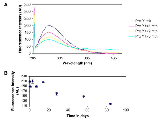 Solid-state (ss) fluorescence study of temperature stress effect on lyophilized protein stability. Subfigure (A) presents the fluorescence spectra at various time points during incubation at 60 °C. The decrease in intensity can be clearly observed. Further, the subfigure (B) presents the absolute fluorescence intensity versus time Reproduced with permission from [85], Elsevier, 2008.