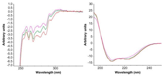 Circular dichroism (CD) spectra for reconstituted lyophilized protein incubated at two different temperatures. Changes in tertiary structure are seen in the near-UV CD spectra on the left, while changes in secondary structure are shown in the far-UV CD spectra on the right. Red spectra—lyophilized protein (control), green spectra—incubation at 37 °C, pink spectra—incubation at 60 °C. Reproduced with permission from [85], Elsevier, 2008.