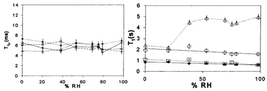ssNMR study of several lyophilized protein formulations containing different amounts of lysozyme and trehalose. On the left average T1ρ is plotted against relative humidity (% RH), whereas on the right average T1 is plotted against % RH.