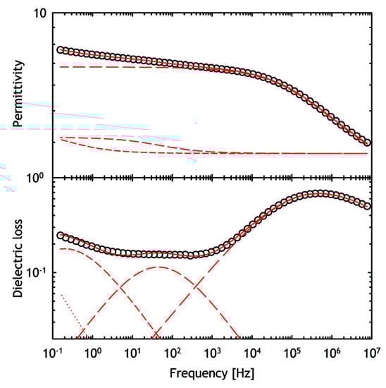 Typical dielectric relaxation spectroscopy (DRS) spectra of lyophilized horse myoglobin powder. Real part (permittivity) and imaginary part (dielectric loss) are presented. Reproduced with permission from [140], ACS, 2009.