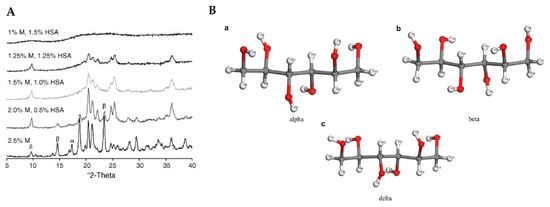 XRD analysis of lyophilized human serum albumin (HSA) formulations with different amounts of mannitol (M) is depicted in figure (A). Reproduced with permission from [153], Elsevier, 2006. In figure (B) the three forms of mannitol (a—alpha, b—beta and c—delta) are depicted in structural arrangements. Reproduced with permission from [154], Elsevier, 2020.