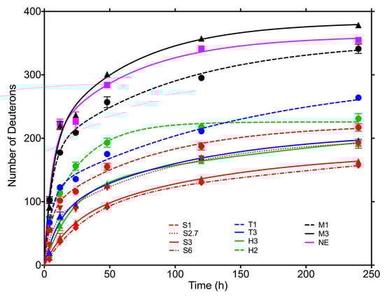 Time dependence of deuterium exchange for lyophilized monoclonal antibody in several different formulations (exposure to D2O vapor at 11% RH and 22 °C). Formulations: M3, mannitol 3:1; M1, mannitol 1:1; S6, sucrose 6:1; S3, sucrose 3:1; S2.7, sucrose 2.7:1; S1, sucrose 1:1; T3, trehalose 3:1; T1, trehalose 1:1; H3, histidine 3:1; H2, histidine 2:1; NE (no-excipient), without excipient. Ratios represent excipient/antibody w/w ratio. Reproduced with permission from [137], ACS, 2018.