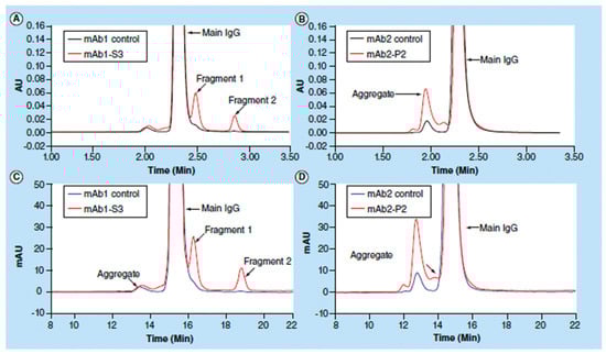 Size-exclusion chromatography (SEC) analyses of control monoclonal antibodies mAb1 and mAb2, antibody mAb1 after thermal stability studies for 3 months and an in-process antibody mAb2. Chromatograms (A,B) were obtained using UHPLC (ultra high-performance liquid chromatography), whereas chromatograms (C,D) were obtained by HPLC. Reproduced with permission from [185], Elsevier, 2018.