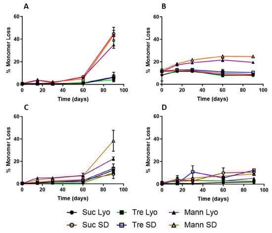 SEC studies on stability of samples containing myoglobin (A), BSA (bovine serum albumine) (B), β-lactoglobulin (C), or lysozyme (D). Formulations are lyophilized (Lyo) or spray-dried (SD) and have three sugar excipients (sucrose—Suc, trehalose—Tre, mannitol—Mann). Reproduced with permission from [175], Elsevier, 2019.