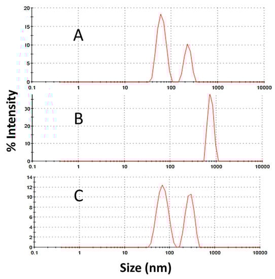 Dynamic light scattering (DLS) analyses for a desorbed quadrivalent human papillomavirus virus-like particles (HPV VLP) vaccine at different pH values: (A) at pH 6.2, (B) at pH 4.0, (C) at pH 8.0. Data are shown as intensity size distribution. Aggregate formation by forced degradation conditions can be observed in Figures (B,C), pH 4.0 and 8.0, respectively. Reproduced with permission from [187], Elsevier, 2017.