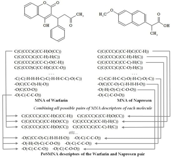 To describe the structures of drug pairs, we used PoSMNA descriptors instead of the MNA descriptors applied in the standard PASS software version [19]. PoSMNA descriptors can be used to predict various phenomena, e.g., synergistic effects of two drugs or the prediction of DDIs. Initially, we developed and used PoSMNA descriptors to predict DDIs severity [15,16]. The set of PoSMNA descriptors is the direct product of a combination of two sets of MNA descriptors for each molecule in the DDI pair as {a,b,c,…} × {d,e,f,…} = {ad,ae,af,…, bd,be,bf,…, cd,ce,cf,…}. MNA/2 (second level of MNA descriptors) for non-hydrogen heavy atoms is used for PoSMNA creation. The MNA descriptors are ordered lexicographically for each pair of compounds, for example, from string “C(C(CCC)C(CC-H)C(CC-H)) C(C(CCC)C(CC-H)O(CC))” to “-O(-C(-C-C-O)) -O(-C(-C-O-O))” (see the examples of PoSMNA descriptors for warfarin and naproxen in Figure 1).