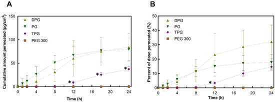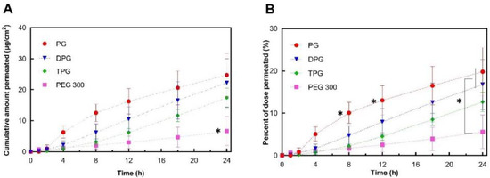 - Trottet, L.; Merly, C.; Mirza, M.; Hadgraft, J.; Davis, A.F. Effect of finite doses of propylene glycol on enhancement of in vitro percutaneous permeation of loperamide hydrochloride. Int. J. Pharm. 2004, 274, 213–219. [Google Scholar] [CrossRef]