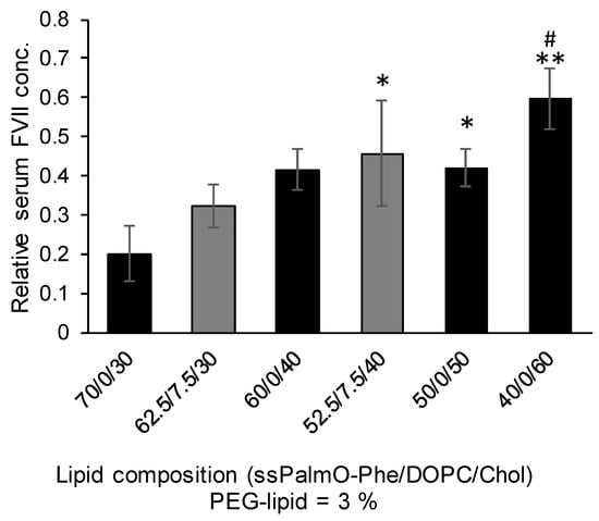 The structure of the lipid components in LNPssPalmO-Phe are summarized in Figure 1. In addition to ssPalmO-Phe as an ionizable lipid, DOPC, cholesterol, and PEG–lipid were incorporated to increase the stability of LNPssPalmO-Phe. The PEG–lipid is incorporated to improve the colloidal stability of LNPssPalmO-Phe by forming a hydrophilic layer on the surface of the particles. In a previous report, it was revealed that the optimal composition for LNPssPalmO-Phe was ssPalmO-Phe/DOPC/Chol = 52.5/7.5/40 with an additional 3% PEG–lipid. For siRNA delivery by another derivative of ssPalm (ssPalmE-P4C2, as described in Section 3.2.1), however, the optimal composition for the hepatic delivery of the siRNA was ssPalm/Chol = 70/30 []. Based on these previously published results, the knockdown efficiency against a liver specific gene (FVII) was evaluated using the LNPs in which 30–60% of cholesterol had been incorporated. In addition, the 7.5% of ssPalmO-Phe was replaced with DOPC in the 30% and 40% cholesterol groups (Figure 2). The serum concentration of the FVII at a dose of 0.02 mg/kg siFVII was evaluated 24 h after administration. As a result, LNPssPalmO-Phe formed with less cholesterol content exhibited a higher knockdown efficiency. The most efficient lipid composition was determined to be ssPalmO-Phe/Cholesterol = 70/30 without DOPC.