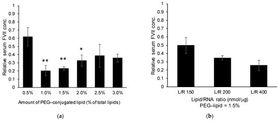 (a) Effects of the amount of PEG–lipid used (3 mice/group). siFVII was encapsulated in LNPssPalmO-Phe. The composition of the lipid was ssPalmO-Phe/cholesterol = 70/30 with the indicated amount of PEG–lipid. Statistical analyses were performed by one-way ANOVA followed by Tukey–Kramer test; *: p < 0.05 against 0.5% PEG modification, **: p < 0.01 against 0.5% PEG modification. (b) Effects of the lipid/RNA ratio (3 mice/group). LNPssPalmO-Phe containing ssPalmO-Phe/cholesterol = 70/30 with 1.5% DMG-PEG2000 was prepared with different ratios of lipid/siRNA (nmol/μg). Mice were intravenously injected with LNPssPalmO-Phe via the tail vein. The doses were 0.02 mg/kg siRNA and 0.01 mg/kg siRNA for (a) and (b), respectively. At 24 h after injection, the serum concentration of FVII was quantified. The relative serum concentration was normalized to the PBS group.